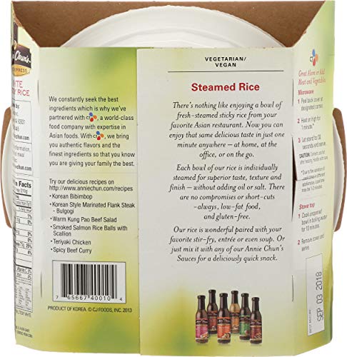 All natural Asian cuisine.Microwaveable. Made with CJ rice. 100% Natural. No MSG. No preservatives. Great alone or add meat and vegetables. There’s nothing like enjoying a bowl of fresh steamed rice from your favorite Asian restaurant. Now you can have that delicious taste in just two minutes without the hassle of using your rice cooker. Our new white sticky rice is highly prized by Korean and Japanese rice connoisseurs – it’s possibly the best rice in the world and doesn’t require lengthy cooking. Each bowl is individually steamed for superior taste, texture, and finish – without adding oil or salt. There are no compromises or shortcuts. You and your family deserve the best. Happy eating! I have always sought out the best possible ingredients for my customers. That’s why I have partnered with CJ, one of the world’s leading food companies with incredible expertise in rice. Together we bring you this delicious fresh steamed rice that’s ready in two minutes. Keep in your pantry or office desk and enjoy restaurant quality rice anytime, anywhere. Quick Tips: This versatile rice is well paired with you favorite stir-fry, entree or even soup! Or use with your favorite sauce for a quick snack. To really make your kids smile, add a little butter and soy sauce. Yum! Product of Korea.