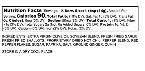 HIGH QUALITY INGREDIENTS – Hot crispy oil is made with only the best top quality ingredients. Made with extra virgin olive oil soybean blend, fresh fried garlic, fresh fried shallots, proprietary dried hot chili pepper blend, salt, red pepper flakes, paprika, ground ginger, cumin, sugar. Have your food taste divine with some extra heat to your plate!