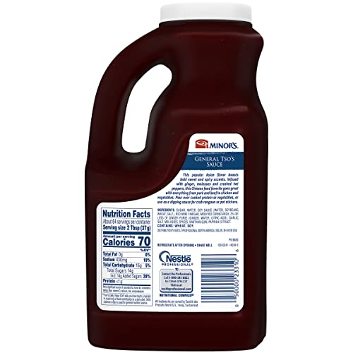 Minor’s General Tso Sauce is a popular Asian flavor that boasts bold sweet and spicy accents. Infused with ginger, molasses and crushed hot peppers, this Chinese food favorite goes great with everything from pork and beef to chicken and vegetables. This sauce is easy to store and pour in an ambient jug format. It’s ready to eat without the added step of cooking to achieve food safety and ready to use without any reconstitution. Refrigerate after opening. Shake well before use. Use traditionally in General Tso Chicken. Perfect for stir-fry, soups, dips, sauces, wraps, salad dressings, or apply directly as a glaze for all meats, chicken, seafood, or vegetables.