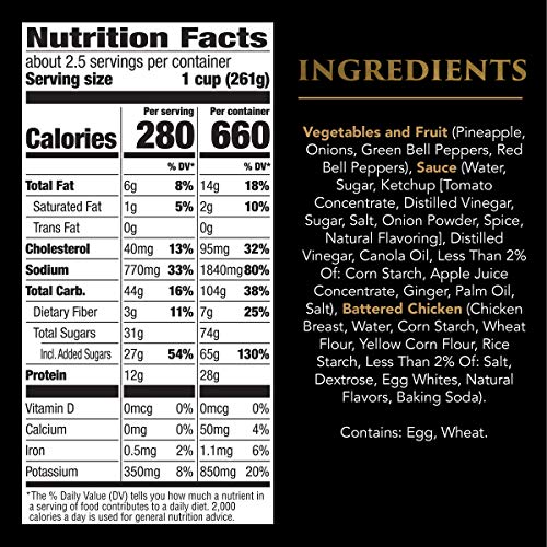These frozen entrees contain battered chicken breast, pineapple, onions and bell peppers in a sweet and tangy sauce