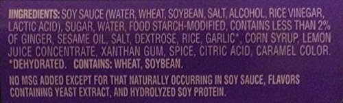 'SOY SAUCE (WATER, WHEAT, SOYBEAN, SALT, ALCOHOL, RICE VINEGAR, LACTIC ACID), SUGAR, WATER, FOOD STARCH-MODIFIED, CONTAINS LESS THAN 2% OF GINGER, SESAME OIL, SALT, DEXTROSE, RICE, GARLIC*, CORN SYRUP, LEMON JUICE CONCENTRATE, XANTHAN GUM, SPICE, CITRIC ACID, CARAMEL COLOR.'