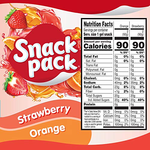 Enjoy a sweet snack with Snack Pack Strawberry and Orange Juicy Gels. These classic-flavored gels deliver an explosion of fruity flavor. Snack Pack Juicy Gels are gluten-free, Kosher, and made with no preservatives or high-fructose corn syrup. Strawberry and Orange Juicy Gels make a perfect dessert after lunch or snack between meals. Snack Pack Strawberry and Orange Juicy Gels have 90 calories with zero grams trans fat per 3.25 oz serving.