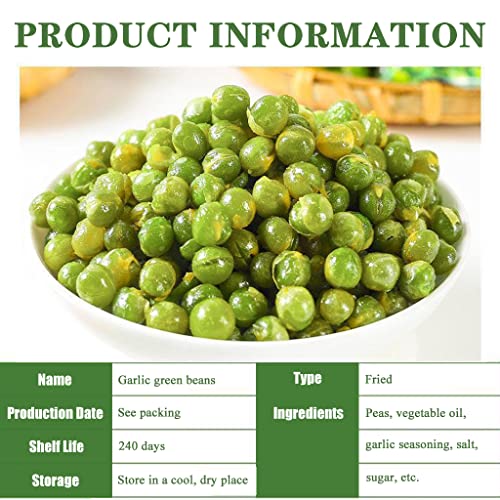Have you been looking for a healthy and tasty snack for yourself or your family? Our garlic peas can be your new favorite. Fragrant and crunchy, our green beans are the perfect addition to snacks that you can share with family and friends.PRODUCT INFORMATIONName: Garlic PeasIngredients: peas, vegetable oil, salt, monosodium glutamate, etc.Weight: 100g/3.52oz per pack, 2packs 200g/7.04ozShelf life: 240 daysProduction date: see the packaging (the date on the packaging is the production date of the product)Storage method: keep in a cool, dry placeHow to eat: open the bag and eat immediatelyAFTER-SALES SERVICEIf you have any questions, you can contact us at any time, we will reply you in time within 24 hours and provide you with warm service.