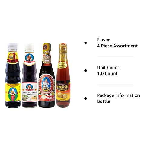 Enjoy these carefully curated sets of Thai cooking sauces to make authentic Thai food. We have done extensive research and handpicked the best sauces in each category. Each is imported directly from Thailand. You are basically buying the sauces that Thai household, street vendors and restaurants use in Thailand.This Essential Set is designed for people who want to get their feet wet, but still cook rather often. It comes in medium-size bottle and comprises of 4 most frequently used sauces. You will be able to cook various types of stir-fry dishes, Pad Thai, curries and many more.Healthy Boy Thin Soy Sauce 10 Fl Oz (300ml): don’t mistake this Thai thin soy sauce with Chinese or Japanese counterparts. If you want to cook authentic Thai food, this is the one.Healthy Boy Sweet Soy Sauce 14 Oz (400g): like molasses’ flavor and consistency, it is viscous and sweet. It is must-have to cook Pad See Ew (Thai Stir fried noodles).MaeKrua Thai Oyster Sauce 10 Fl Oz (300ml): MaeKrua Oyster sauce is hand down THE oyster sauce for Thai Food. It is saltier and less sweet than Chinese or Hongkong-style Oyster Sauces.Abalone Premium Fish Sauce 10 Fl Oz (300ml): you cannot cook good Thai food without high quality fish sauce. Abalone is a premier brand of fish sauce. Try to make Papaya Salad with this and you will be surprised what a difference it makes.