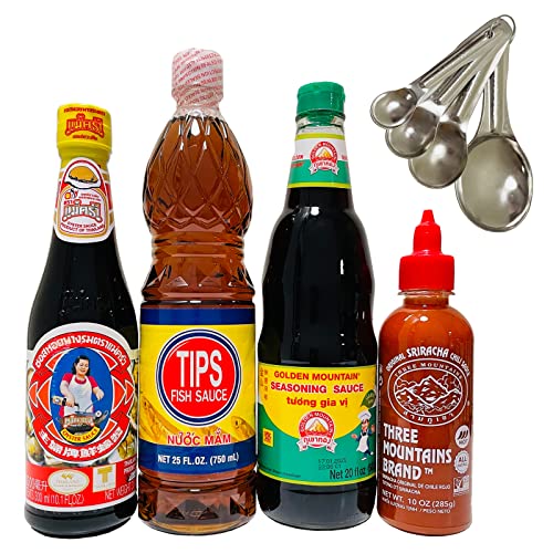 Thai Oyster Sauce 11.8 oz | Fish Sauce 25 oz | Seasoning Sauce 20 oz | Original Sriracha Chili Sauce | Complimentary 4 Set Stainless Steel Measuring Spoons (Pack of 5 Authentic Thai Sauce Bundle) (Stir-Fry Set 2)